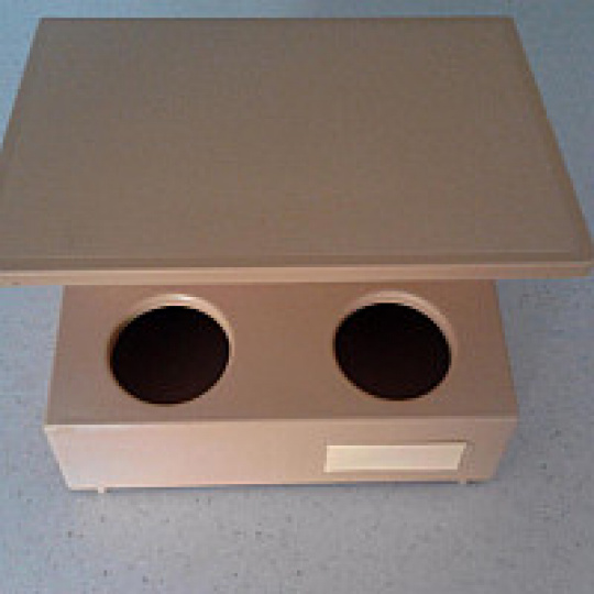 Plastové krmítko, gritník, 2 oddělené boxy s otvory na krmivo, nebo grit s otvory o průměry 4,5cm pro odchov. Krmítko je pro holuby, bažanty a exoty. Délka je 25cm, šířka 12cm, výška 14cm.