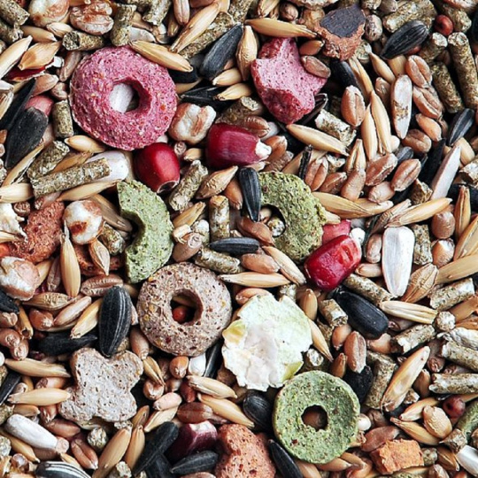 Plnohodnotné krmivo vyrobené z kvalitních pečlivě vybraných surovin vhodné pro každodenní krmení.Složení: EX kroužky mix barev, Popcorn - pšeničný, EX křížky mix barev, vločky hrachové, vločky, kukuřičné, saflor (Cardi), čirok červený (milo), slunečnice černá, slunečnice žíhaná-drobnozrnná, kukuřice, ječmen, pšenice, oves, granule pro hlodavce 5mm, podzemnice loupaná, slunečnice bílá- česká, svatojánský chléb, čirok bílý (dari).