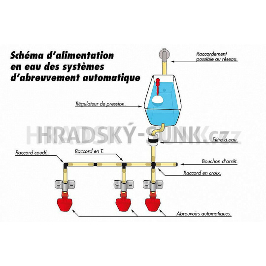 Výškové upevnění musí být takové, aby se králík při odpočinku neopřel o čidlo napáječky a voda nevytekla do kotce. Armatury jsou tvaru T , rovná spojka a kolínko, vše na hadičku prů. 9mm. Armatura T není součástí napáječky, je nutné si ji přiobjednat.