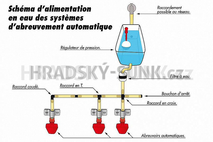 Výškové upevnění musí být takové, aby se králík při odpočinku neopřel o čidlo napáječky a voda nevytekla do kotce. Armatury jsou tvaru T , rovná spojka a kolínko, vše na hadičku prů. 9mm. Armatura T není součástí napáječky, je nutné si ji přiobjednat.