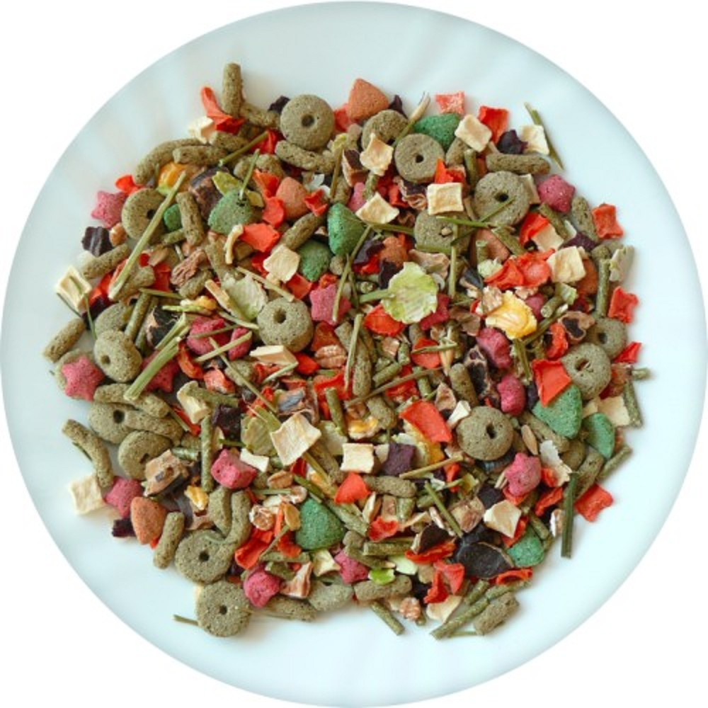 Složení: zelenina (mrkev, červená řepa, pastyňák, petržel), vojtěška, hrachové vločky, extrudovaná pšenice, extrudovaná kukuřice, rohovník obecný, pšeničné vločky, ječmen, oves.Deklarované jakostní znaky: hrubý protein 12,2%, hrubá vláknina 13,8%, hrubé oleje a tuky 2,5%.Denně zajistěte dostatek pitné vody.