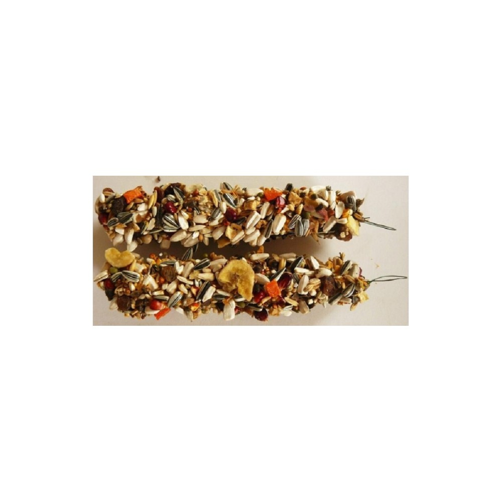 Tyčinky jsou vyrobeny z bohaté směsi zrnin a dalších přírodních surovin, včetně medu a přirozenými zdroji vitamínů A, C, D, E, řady B a minerálií a proto jsou nepostradatelným doplňkem každodenní stravy. Tyčinky nutí Vašeho malého přítele, tak jako v přirozeném prostředí, vyvinout úsilí k zíkání potravy a tím přinášejí zabavení pro zkrácení dlouhé chvíle.Složení: obiloviny, ovoce, pekařské výrobky, minerální látky, oleje a tuky. S barvivy E-102, E-110, E-132.Jakostní znaky: hrubý protein 13%, hrubá vláknina 8%, hrubé oleje a tuky 12%, vlhkost 12%.Návod na použití: zavěste do klece. Doporučujeme podávat 1-2 tyčinky za týden. Čerstvou pitnou vodu musí mít k dispozici po celý den.Tyčinky jsou pochoutkou, výživným krmivem a hračkou zároveň.