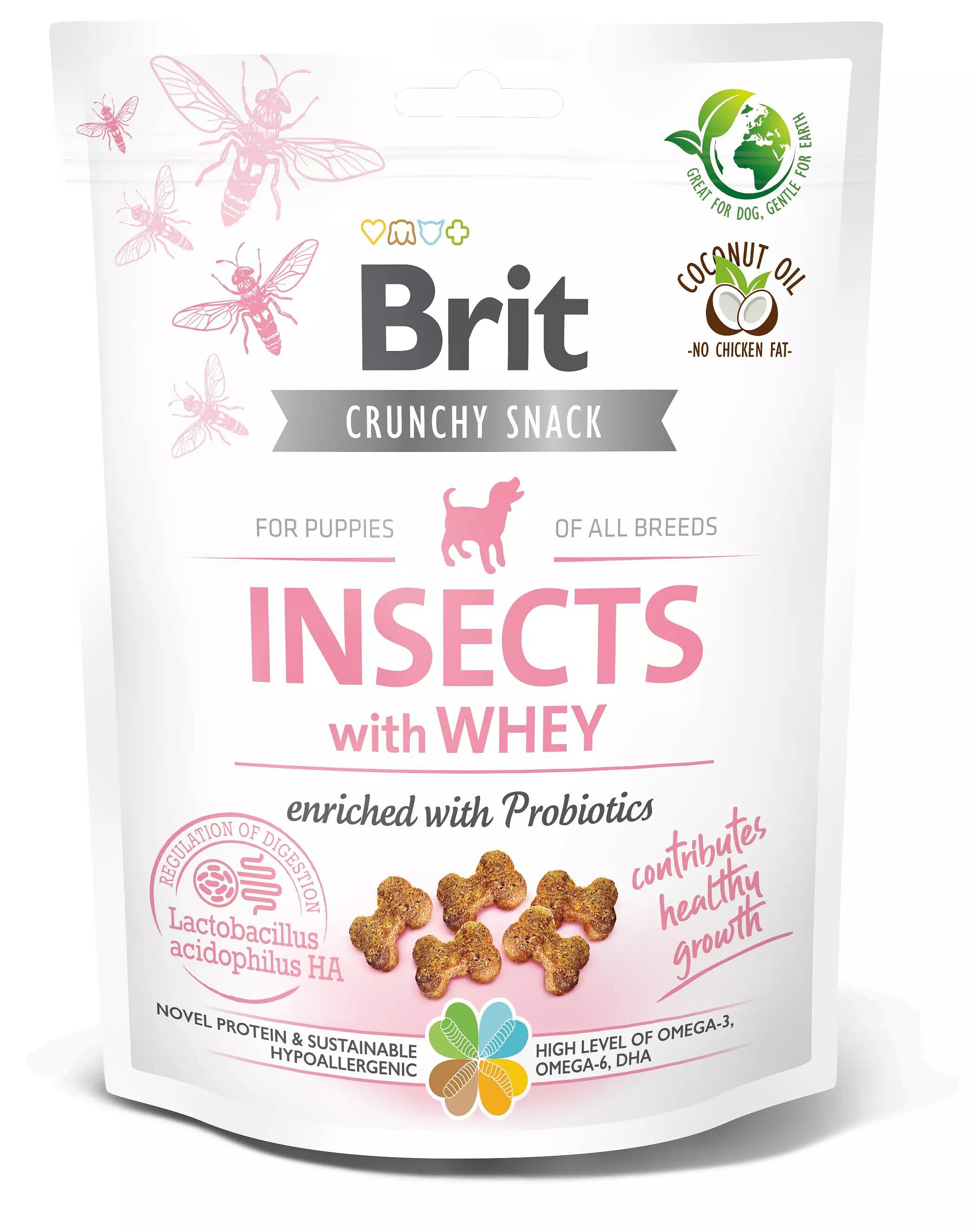 Brit Crunchy Snack - nové křupavé pamlsky pro psí miminka obsahují hmyzí protein obohacený o syrovátku a probiotika. Kvalitní probiotika přispívají ke zdravému a bezproblémovému růstu štěněte. Hmyzí pamlsky pro psy Brit Insect jsou hypoalergenní (vhodné i pro citlivé jedince).