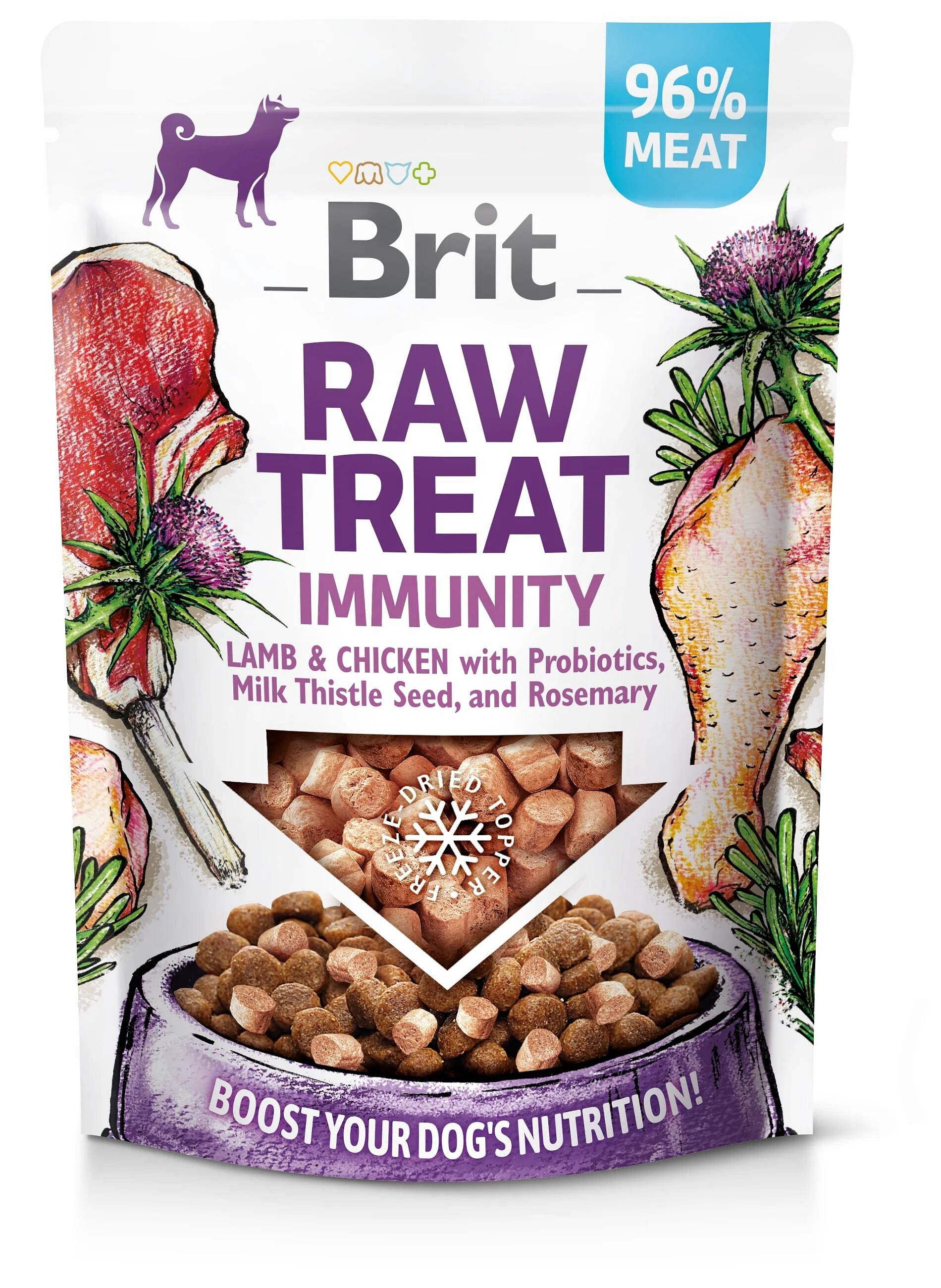Chutný pamlsek s označením Raw Treat je vyráběn speciální technikou, kdy jsou suroviny sušeny mrazem. Jedná se o pamlsky pro psy, které jsou skvělým funkčním doplňkem ke granulím (např. Brit Care Sustainable, Brit Care Hypoallergenic nebo Brit Care Grain-Free). Snacky Immunity obsahují jehněčí a kuřecí maso, které je doplněno o probiotika, semena ostropestřce mariánského a rozmarýn.