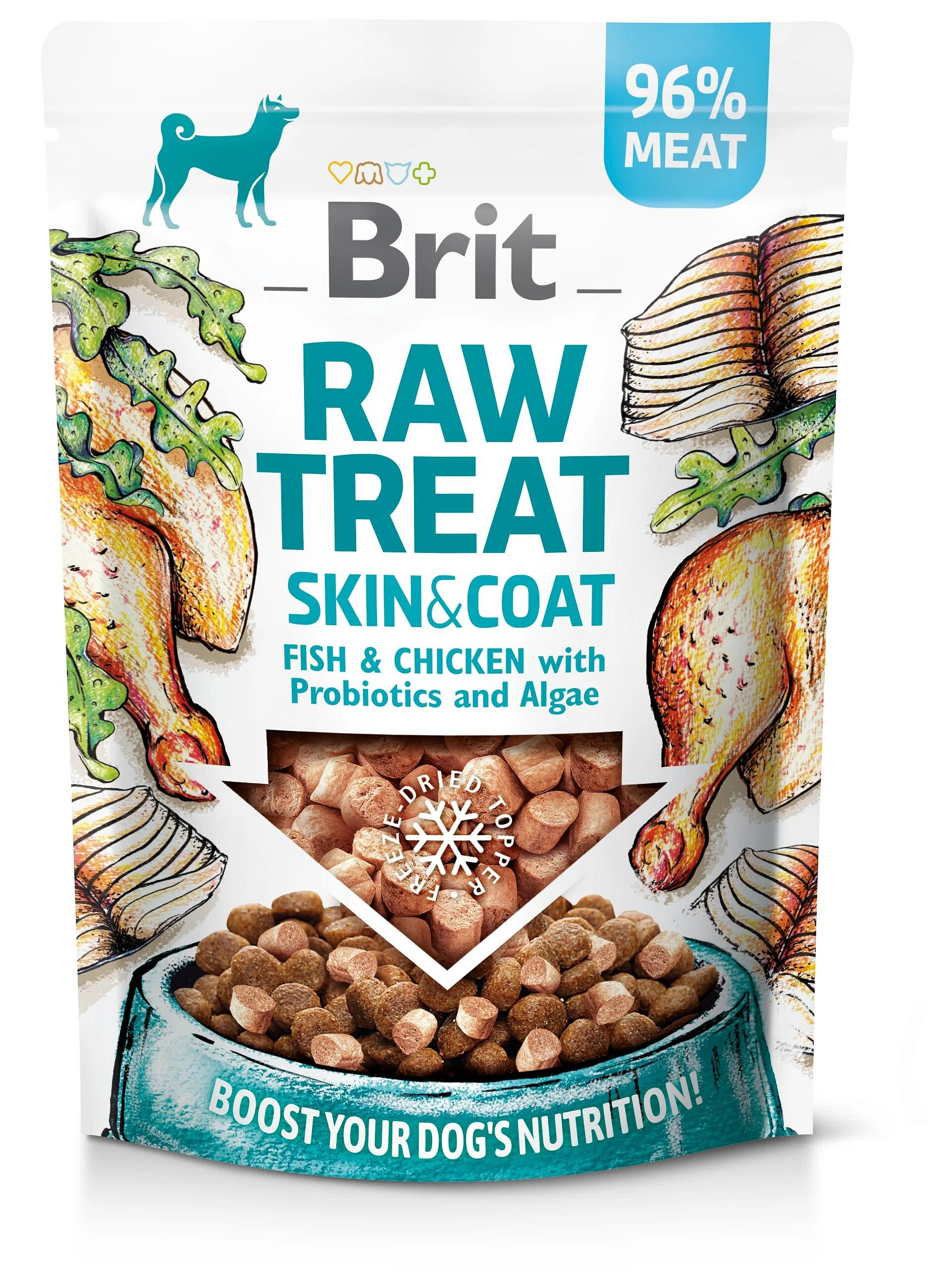 Chutný pamlsek s označením Raw Treat je vyráběn speciální technikou, kdy jsou suroviny sušeny mrazem. Jedná se o pamlsky pro psy, které jsou skvělým funkčním doplňkem ke granulím (např. Brit Care Sustainable, Brit Care Hypoallergenic nebo Brit Care Grain-Free). Snacky Skin & Coat obsahují rybí a kuřecí maso, které je doplněno o probiotika a řasy.
