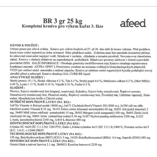Plnohodnotné finální krmivo, určené pro dokrmení brojlerových kuřat do porážky. Podávání po BR 2 zajišťuje optimální růst, nízkou spotřebu krmiva a dobrý zdravotní stav Vašich zvířat. Ochranná doba: 0 dní.