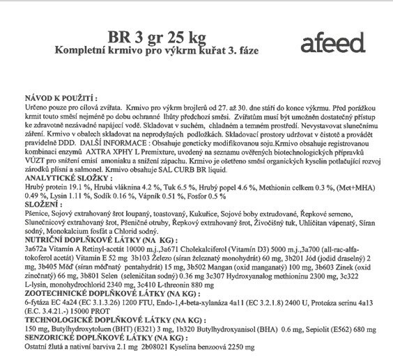 Plnohodnotné finální krmivo, určené pro dokrmení brojlerových kuřat do porážky. Podávání po BR 2 zajišťuje optimální růst, nízkou spotřebu krmiva a dobrý zdravotní stav Vašich zvířat. Ochranná doba: 0 dní.