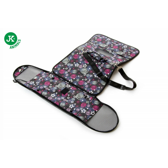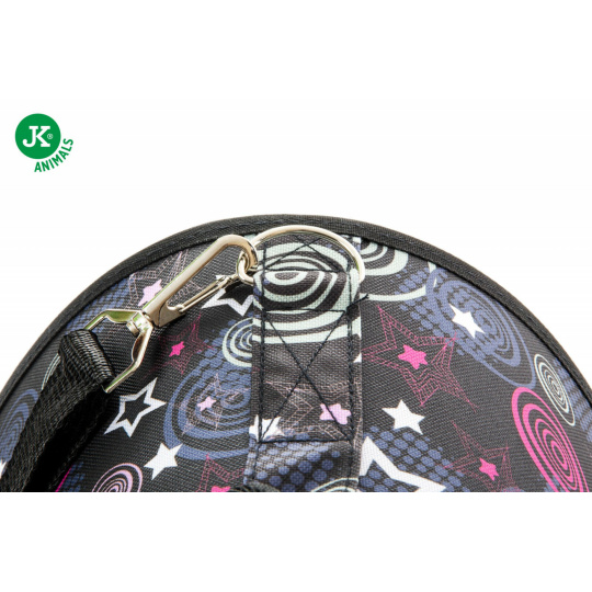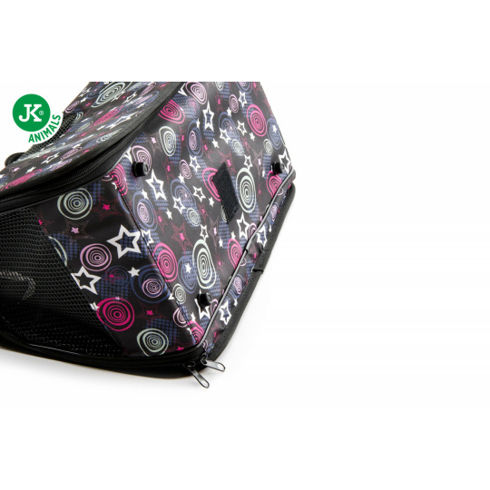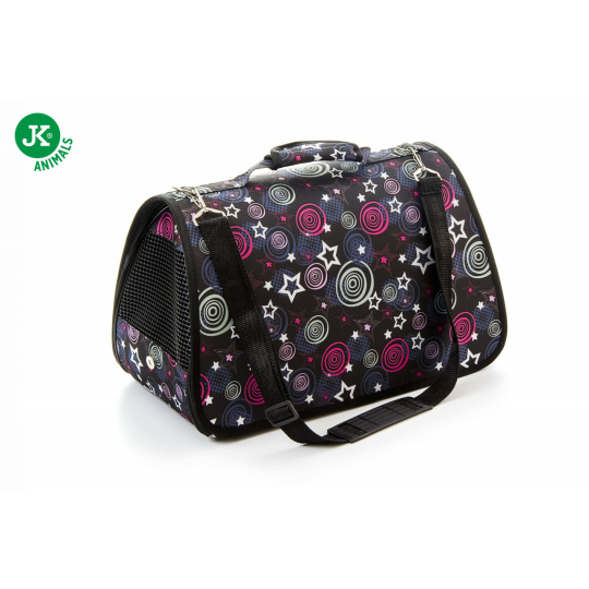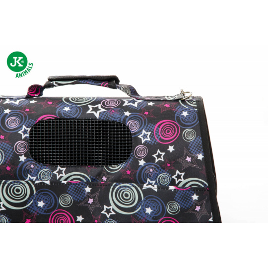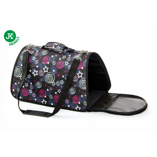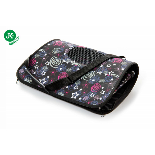 Cestovní taška Galaxy M, pro střední psy. Tato cestovní taška pro psy a kočky je vyrobena z lehkého voděodolného nylonu a je opatřena velkými větracími otvory. Taška je vhodná pro malé psy a kočky. Otevírání tašky je pomocí zipu. Tašku lze zcela rozložit sepnout pomocí suchého zipu do malého tvaru a jako plochou ji uschovat například do skříně. Taška má pevné madlo, ale také odnímatelný popruh pro pohodlnější přenášení. Díky velkým větracím otvorům se pes nebo kočka na cestách cítí dobře. Na boční straně je malá kapsa. Ze spodní strany má taška čtyři pevné plastové nožky. Uvnitř tašky se nachází poutko s karabinou pro zajištění psa nebo kočky.