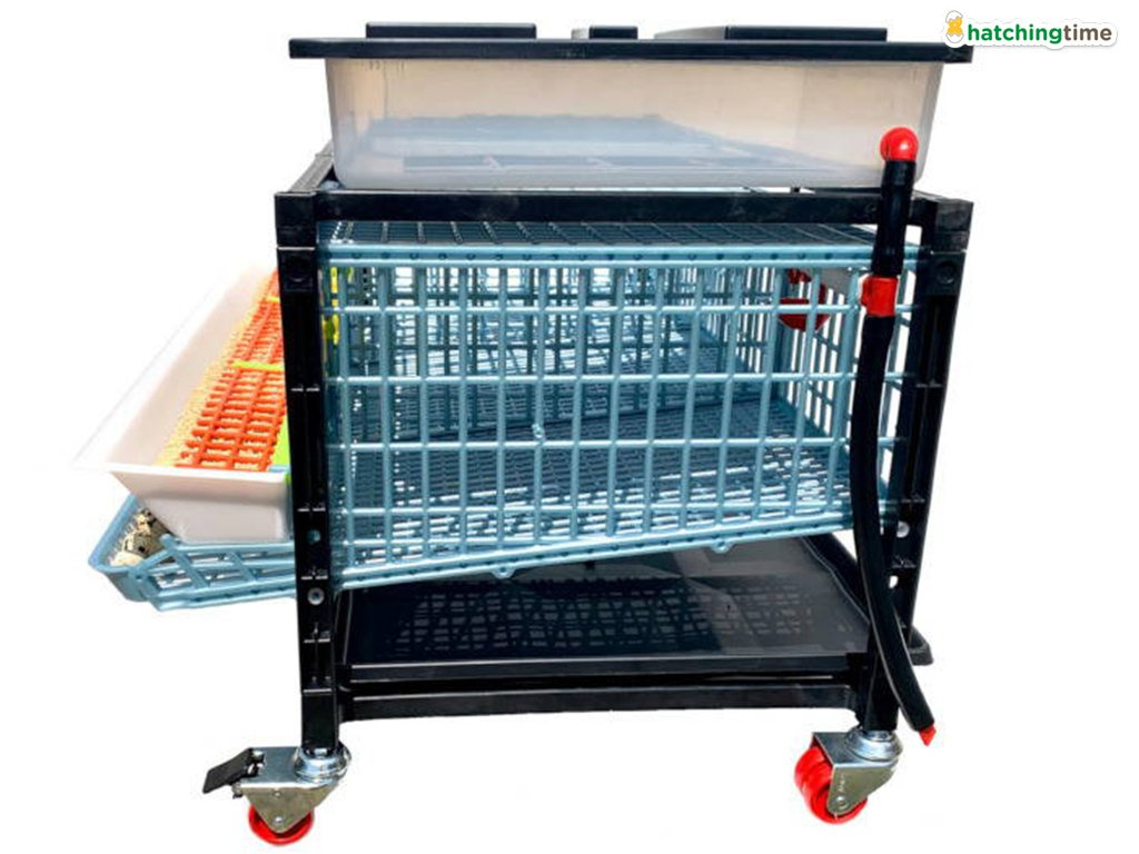 Rozměry složené klece pro křepelky včetně koleček, nádržky na vodu, krmítka a snáškových zásobníků jsou 98 x 62 x 59 cm.