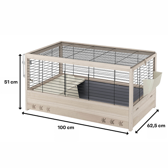 Arena 100 je prostorná klec ideální pro králíky. Jedinečnost této klece spočívá v praktičnosti a elegantní kombinaci dřeva a kovové mřížky, která působí přirozeně a zároveň moderně.