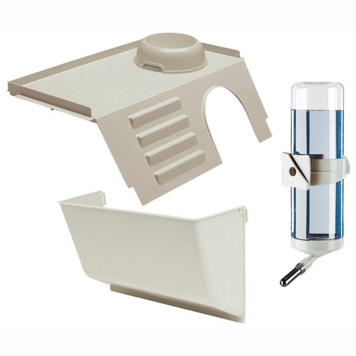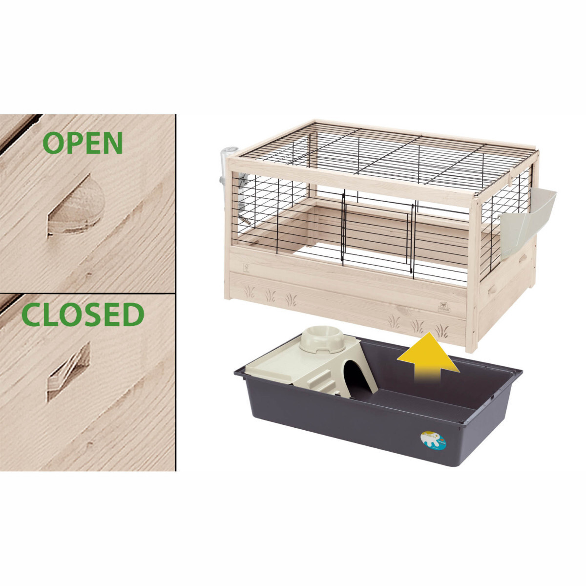 Vrchní posuvná mřížka se po uvolnění západek jednoduše odsune, což umožňuje pohodlný přístup do klece. Malá posuvná dvířka na přední straně pak slouží pro každodenní manipulaci, krmení nebo kontakt s vaším mazlíčkem.