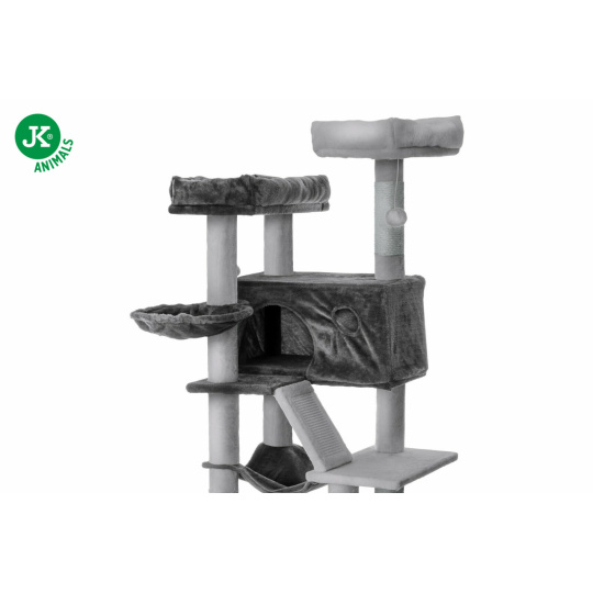 Praktické velké a vysoké škrabadlo pro kočky žijící v bytě s mnoha zónami odpočinku i aktivit. Toto velké škrabadlo se hodí do domácností i s více kočkami, které si s ním užijí spoustu zábavy. Vysoké škrabadlo obsahuje dvě uzavřené vyvýšené skrýše, dvě vyvýšené odpočinkové plochy pro spaní s jemným polstrováním. Pelíšek je umístěný v prostoru. Dvě patra s vyhlídkou a šikmou plochou pro škrábání a jeden prostor na válení mezi sloupy najdete ve střední části tohoto velkého škrabadla. Nechybí ani dvě hračky v podobě plyšových zavěšených bambulí. Sloupy jsou potažené odolným přírodním sisalem. Sloupy jsou potažené odolným přírodním sisalem vhodným pro péči a udržování drápků.