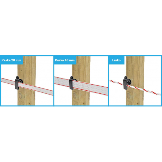 Kvalitní plastový izolátor s UV ochranou je určen pro pásky do 40 mm a lanka do ∅ 6 mm.