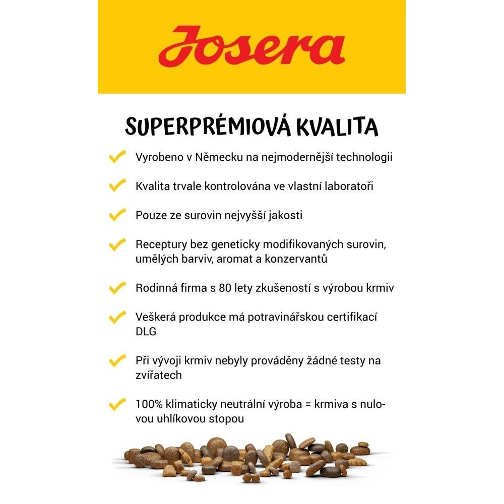 - proti chlupovým bezoárům: Vaše kočka tráví velkou část dne péčí o svůj kožíšek. Přitom spolyká často chlupy, z kterých se mohou vyvinout nepříjemné chlupové bezoáry. Speciální dietní vláknina v krmivu pro kočky podporuje pohyb spolknutých chlupů trávicím traktem a redukuje tak tvorbu chlupových bezoárů - kůže & srst: lesklý a hebký kožíšek stejně jako zdravá kůže jsou známky optimální výživy Vaší kočky. To zajišťují omega 3 a omega 6 mastné kyseliny, vitamín E a biotin stejně jako zinek v lehce vstřebatelné organicky vázané formě - kontrola pH: pečlivý výběr surovin zajišťuje optimální poměr vápníku a fosforu a nižší obsah hořčíku. Tím je docíleno optimálního pH v močových cestách a předchází se vzniku močových kamenů - vitalita: obsah kvalitních proteinů zaručuje dobrou stravitelnost a redukuje množství exkrementů. Kvalitní aminokyseliny, aktivní účinky kvasnic a spousta vitamínu E posilují imunitní systém. Krmivo Josera je vyráběno v souladu s nejnovějšími vědeckými poznatky ve spolupráci s odborníky a odbornicemi. Produkty Josera jsou optimálně nastaveny dle individuálních potřeb Vaší kočky.