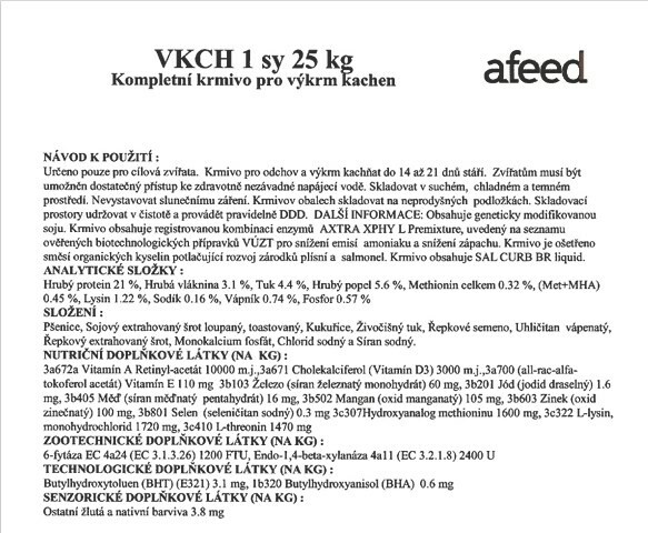 • VKCH-1   Plnohodnotné startérové krmivo určené pro výkrm kachen a hus do 14.dne věku. Zkrmování od vylíhnutí zabezpečuje optimální růst a dobrý zdravotní stav.