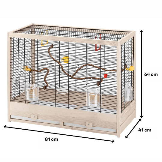 Elegantní klec Giulietta 6 pro kanárky, andulky a drobné exoty. Spojení krásy a elegance severské borovice s certifikací FSC™. Základem klece je robustní dřevěná konstrukce. Nákupem tak podporujete správné a zodpovědné lesní hospodaření. Dřevo je ošetřeno speciálním, netoxickým a dlouhotrvajícím nátěrem, který je odolný vůči UV záření, odpuzuje vodu a má protiplísňové vlastnosti. To vše pro maximální bezpečnost a dlouhou životnost klece. Mřížka je pak vyrobena z recyklovaného materiálu s odolným barevným lakem.
