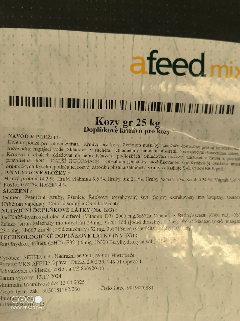 Krmivo pro ovce a kozy. Zvířatům musí být umožněn dostatečný přístup k zdravotně nezávadné napájecí vodě. Krmivo skladovat v suchém prostředí v obalech na neprodyšných podložkách. Ochranná lhůta 0 dní.