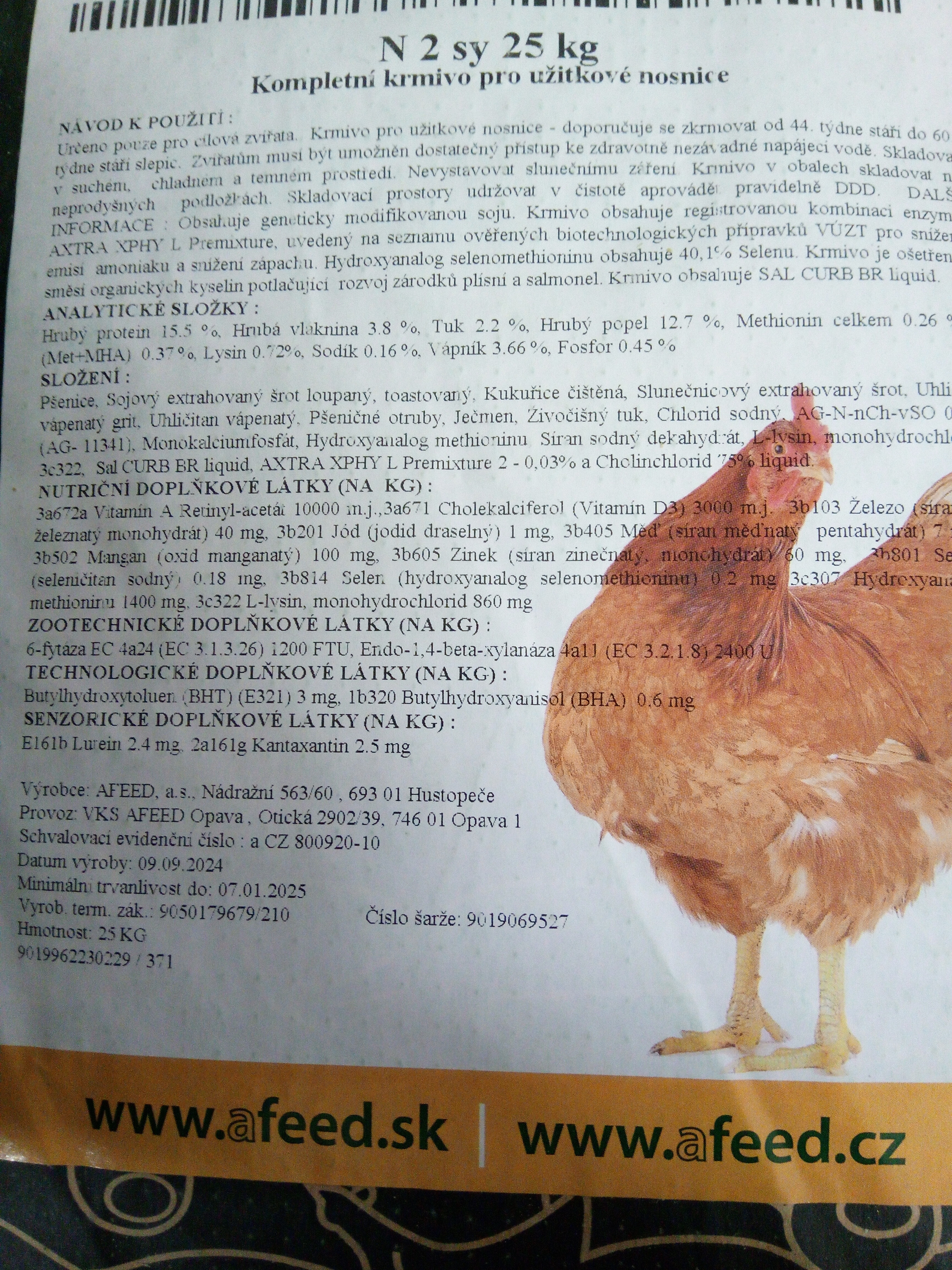 3a671 vitaminD3 2,80 t.m.j./kg, 3a672a vitamin A 9,60 t.m.j./kg, 3b202(jodičnan vápenatý) I 0,80 mg/kg, 3b502(oxid manganatý)