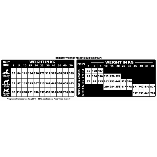 Analytické složení: Hrubý protein (29 %), hrubý tuk (15 %), hrubá vláknina (2,75 %), hrubý popel (8 %), vápník (1,9 %), fosfor (1,35 %), omega 3 mastné kyseliny (0,20 %), omega 6 mastné kyseliny (3,10 %).