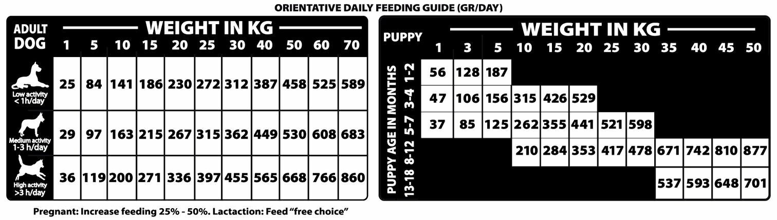 Analytické složení: Hrubý protein (29 %), hrubý tuk (15 %), hrubá vláknina (2,75 %), hrubý popel (8 %), vápník (1,9 %), fosfor (1,35 %), omega 3 mastné kyseliny (0,20 %), omega 6 mastné kyseliny (3,10 %).