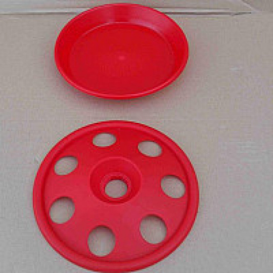 Napájecí talíř s otvory a závitem na plastovou láhev pro malou drůbež, holuby, exoty i venkovní ptactvo.