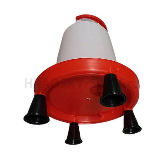 Napáječka plastová, dva díly spojeny bajonetovým závitem,pootočením se spojí, nebo oddělí,ve středu talíře je plastová zátka s těsněním(okroužkem), kterou se plní spojená napáječka se překlopí, vyšroubuje se zátka a naplní, po zašroubování se překlopípři manipulaci si musíme uvědomit, že 15l = 15kg. Na spodní talíř nasuneme nožky.V teplých dnech přidáváme do vody Acidomid D, který dezinfikuje vodu a prodlužuje dobu použitelnosti, navíc je proti všem bakteriálním nemocem - včetně kokcidiozi. Acidomid není lék, ale prochází do střev, kde silně potlačuje rozvoj kokcidijí, návod je na obalu.