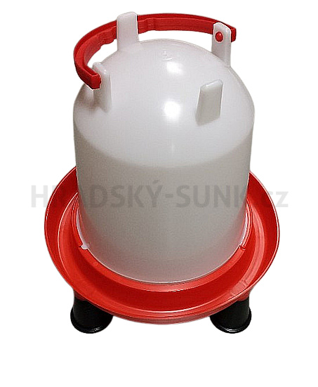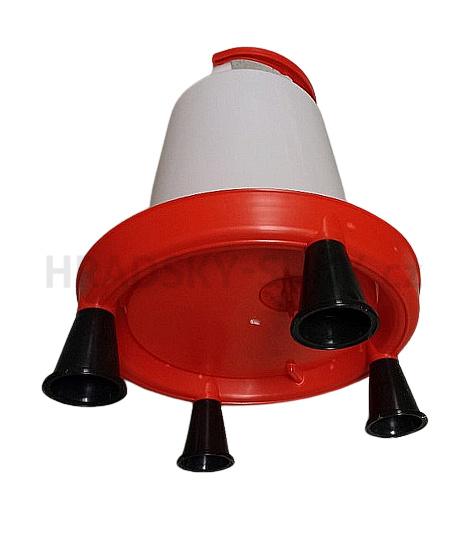 Napáječka plastová, dva díly spojeny bajonetovým závitem,pootočením se spojí, nebo oddělí,ve středu talíře je plastová zátka s těsněním(okroužkem), kterou se plní spojená napáječka se překlopí, vyšroubuje se zátka a naplní, po zašroubování se překlopípři manipulaci si musíme uvědomit, že 15l = 15kg. Na spodní talíř nasuneme nožky.V teplých dnech přidáváme do vody Acidomid D, který dezinfikuje vodu a prodlužuje dobu použitelnosti, navíc je proti všem bakteriálním nemocem - včetně kokcidiozi. Acidomid není lék, ale prochází do střev, kde silně potlačuje rozvoj kokcidijí, návod je na obalu.