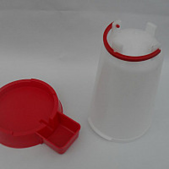Plastová dvoudílná napáječka s ručkou a miskou, určená pro malou drůbež.