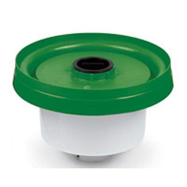 Velmi kvalitní napáječka, která se plní dnem, šroubovacím otvorem a zátkou. Není třeba při plnění dělit nádobu a talíř, dělí se pouze při čištění od nečistot, nebo řas, způsobené teplem. Napáječku lze zavěsit , nebo položit a z dálky je vidět, kolik vody je uvnitř. U všech napáječek je lepší, když jsou umístěny pod přístřeškem, pokud prší a je napáječka volně ve výběhu, jsou stěny talíře i uvnitř znečištěny.