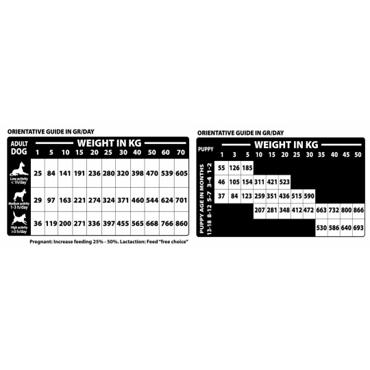 Složení: Dehydratovaný tuňák tuňák (20 %), celozrnná rýže (18 %), hrách, mletá rýže, čerstvá bílá ryba (10 %), kuřecí olej, pivovarské kvasnice (MOS), rýžový protein, čočka (2 %), hydrolyzovaný losos, lněné semínko, karob, jablečná dřeň (600 mg/kg), minerální látky, lososový olej, mrkev (1 000 mg/kg), hruška (500 mg/kg), čekanka (FOS) (500 mg/kg), juka schidigera, glukosamin a chondroitin.