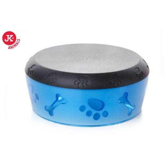 Barevná plastová miska pro psy modro-bílá, malá, 300 ml, 10,5 cm, s protiskluzovou gumovou spodní částí. Luxusní plastová miska v dvoubarevném provedení pro psa je elegantním doplňkem Vaší stylové domácnosti. Miska je zespodu opatřena gumovým povrchem aby neklouzala po podlaze. Uvnitř misky je bílý plast a zvenčí je průhledný barevný plast s průhledy dovnitř ve tvaru tlapek a kostí.