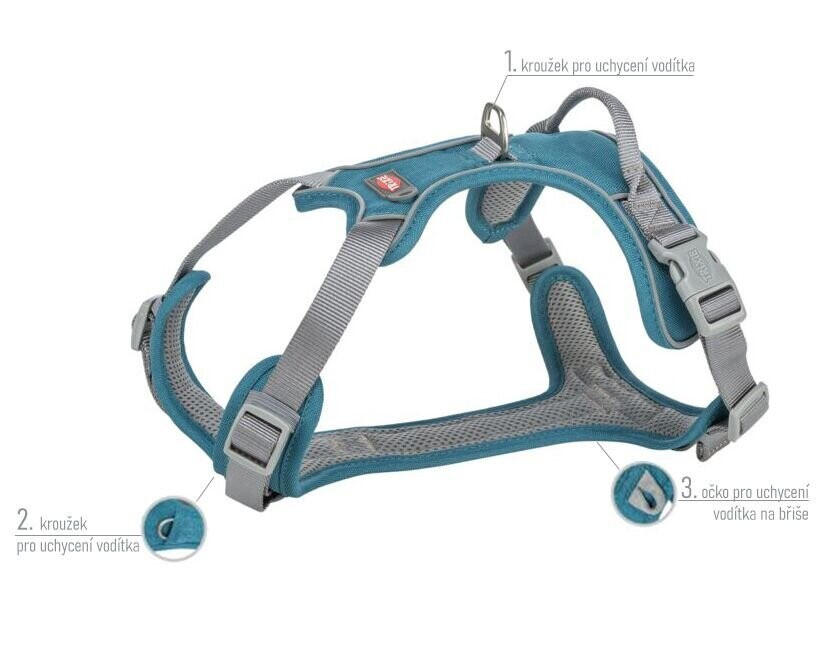 3. očko pro upevnění vodítka na břiše - popruhy na krku a hrudníku jsou plynule nastavitelné
