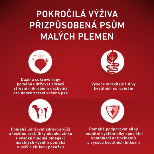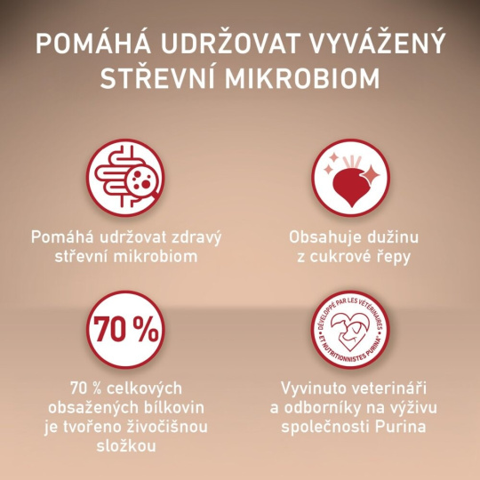 70 % celkových obsažených bílkovin je tvořeno živočišnou složkou. Dužina cukrové řepy pomáhá udržovat zdravý střevní mikrobiom nezbytný pro dobré zdraví vašeho psa. Bez přidaných barviv, bez přidaných umělých konzervantů. S přírodním prebiotikem, které prokazatelně zlepšuje trávení. Pomáhá udržovat zdravou kůži a lesklou srst. Díky obsahu zinku a vysoké hladině omega-3 mastných kyselin pomáhá v péči o citlivou pokožku. Pomáhá podporovat silný imunitní systém díky speciální kombinaci antioxidantů a vysoce kvalitních bílkovin. Vysoce stravitelné díky kvalitním surovinám.