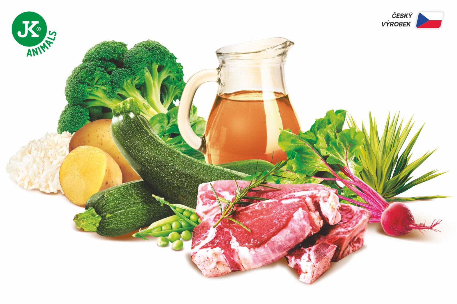 Složení: 28 % sušeného hovězího masa, 19 % sušeného telecího masa, 15 % brambor, rýže, kuřecího tuku (chráněno směsí tokoferolů, zdroj vitamínu E), 3,5 % sušených jablek, 2 % zeleného hrachu, pivovarských kvasnic (zdroj mannanoligosacharidů), 2 % lososového oleje, kuřecích jater, 1 % sušeného špenátu, 0,8 % sušené dýně, 0,5 % sušené červené řepy, 0,2 % sušené brokolice, glukosaminu (350 mg/kg), chondroitin sulfátu (220 mg/kg), extraktu z Yucca schidigera (100 mg/kg), heřmánku (Matricaria chamomilla, 80 mg/kg). Neobsahuje lepek kvůli vyloučení rizika potravinové intolerance. (Procentuální obsah surovin v krmivu je uveden v sušině dle EC 767/2009)