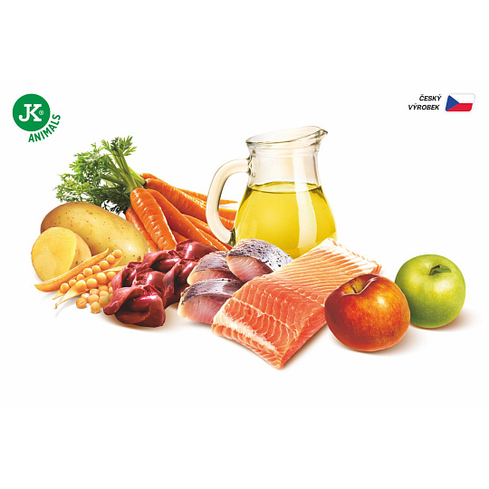 Složení: 26 % lososa (16 % lososové moučky, 10 % celého čerstvého lososa), 26 % sledě, 20 % brambor, 8 % žlutého hráchu, 8 % drůbežího tuku (konzervovaný směsí tokoferolů, zdroj vitamínu E), 4 % sušených jablek, 3 % lososového oleje, 2 % kuřecích jater, pivovarských kvasnic (zdroj mannanoligosacharidů), 1 % mrkve, glukosaminu (300 mg/kg), chondroitin sulfátu (180 mg/kg), výtažku z rostliny Yucca schidigera (100 mg/kg), heřmánku (Matricaria chamomilla, 80 mg/kg). Neobsahuje obiloviny kvůli vyloučení rizika potravinové intolerance. (Procentuální obsah surovin v krmivu je uveden v sušině dle EC 767/2009)