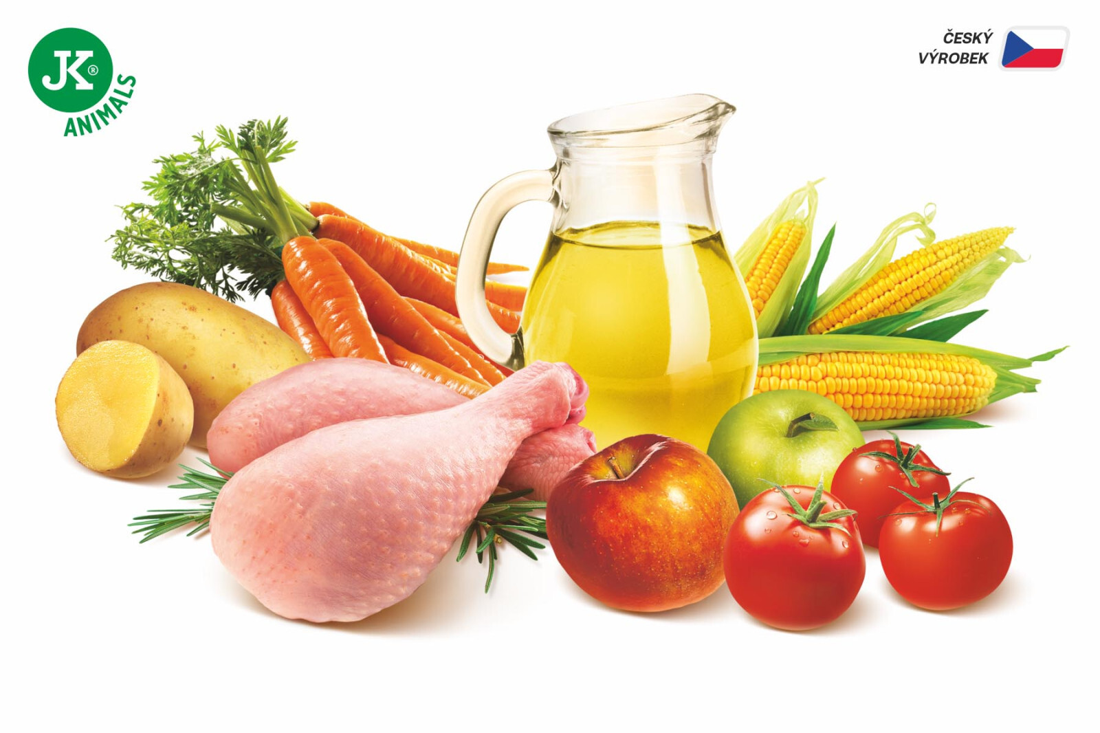 Složení: 28 % kuřete a 12 % kuřecí játry, 10 % brambor, kukuřice, kuřecího tuku (chráněno směsí tokoferolů, zdroj vitamínu E), lososového oleje, přírodní příchutě, sušených jablek, pivovarských kvasnic, rajčat, extraktu z juky, mrkve, minerálů, glukosaminu, chondroitinu, DL-metioninu, L-lysinu, mannanoligosacharidů, fruktooligosacharidů, probiotik, určené pro dospělé psy všech velkých a obřích plemen. (Procentuální obsah surovin v krmivu je uveden v sušině dle EC 767/2009)