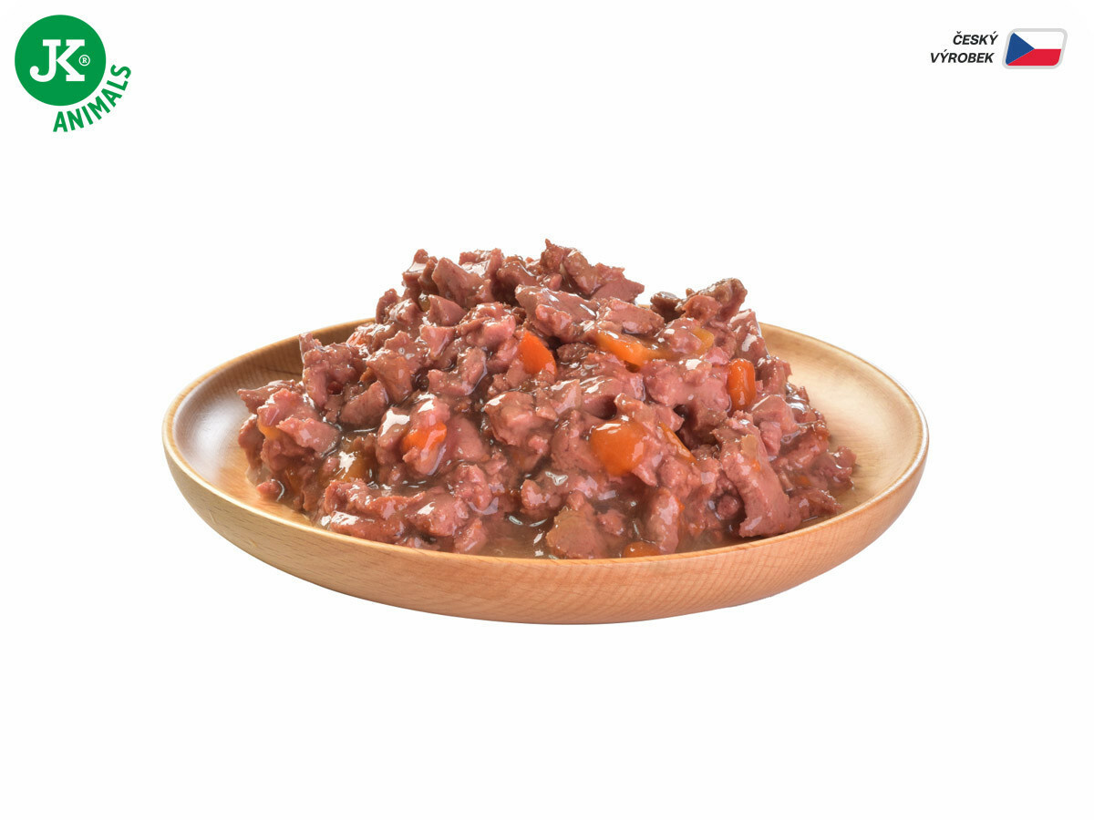 85 % masové filety (77 % kuře, 8 % hovězí), kuřecí vývar, 4 % červená řepa, minerály, hrachový škrob.