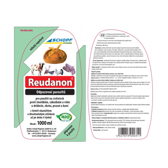 BIO přípravek k odpuzování čmelíků u slepic, rozprašovač, ihned k použití, působí až 4 týdny, až 200 aplikací, 1000ml, Geraniol. Pokud hledáte účinný odpuzovač (repelent) proti čmelíkům, klíšťatům, blechám, vším či zákožkám, máme pro vás skvělý tip. Reudanon spolehlivě ochrání Vaše zvířata před napadením těmito parazity. Repelent je vhodný jak na slepice, holuby, králíky, tak i psy, ovce, prasata, skot či koně. Odpuzovač parazitů se aplikuje se přímo do srsti či peří zvířat a účinkuje až po dobu až 4 týdnů. Tento přípravek s BIO certifikací je vhodný i pro biofarmy, jelikož účinná látka není přijímána do krevního oběhu zvířat, a tak se nedostane do vajec či mléka.