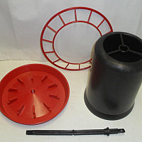 Krmítko je pro všechna suchá krmiva, jak pro dospělou, tak pro kuřata a malou drůbež. Výška dolního talíře je 4 cm. Mřížka po obvodu má 14 mezer. Celková výška se šroubem je 32 cm. Krmítko se dodává bez horního víka, lze i zavěsit, středový šroub má v horní části pevné oko.