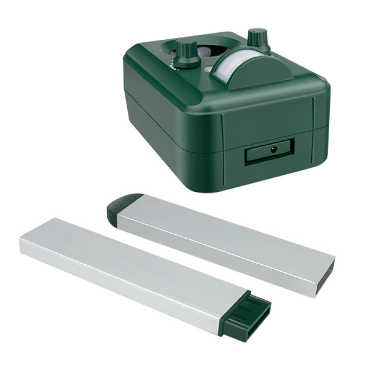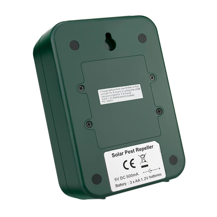 Ultrazvukový odpuzovač vhodný k plašení kun, hlodavců psů, koček, lišek a netopýrů, bezpečný pro člověka. K použití ve vnitřních i venkovních prostorech, vybavený odolným vodotěsným krytem s možností zapíchnutí do země nebo zavěšením na zeď. Odpuzovač s rozsahem tónu v úhlu 110° s plovoucím kmitočtem a dosahem až 1500 m2, s napájením na baterie 3xAA, které se dobíjejí pomocí solárního panelu. Baterie je možné dobít i pomocí dodaného USB kabelu.